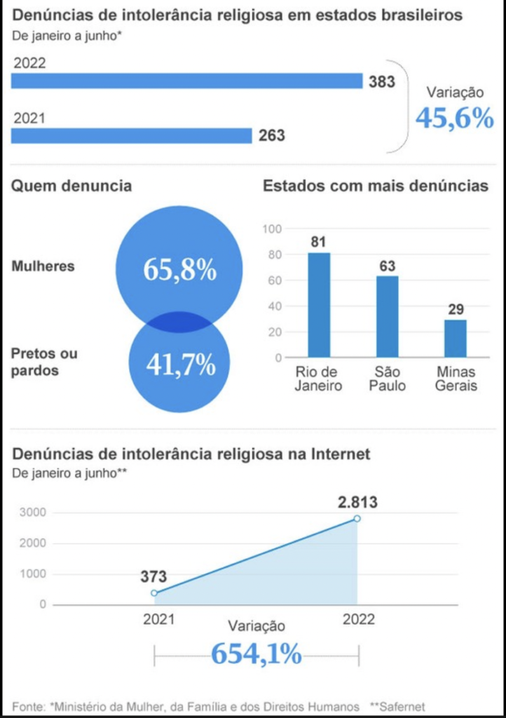 O Brasil é um país considerado uma nação laica, ou seja, que permite a liberdade de crença ou manifestações ligadas a qualquer religião desde que isso não viole uma lei prevista pela constituição nacional, mas, apesar de toda essa liberdade proporcionada ao povo brasileiro, sempre houve pessoas que agiram de forma desrespeitosa com os demais integrantes da sociedade que seguem acreditando em doutrinas distintas. Estatísticas divulgadas pelo G1 apontam que as denúncias de intolerância religiosa desde o ano passado, 2021, aumentaram de forma considerável, tendo como vítimas mulheres, pretos e pardos em maior escala. Além de agressões físicas feitas pessoalmente, os alvos desse tipo de crime também sofrem virtualmente com danos morais como ofensas e xingamentos.