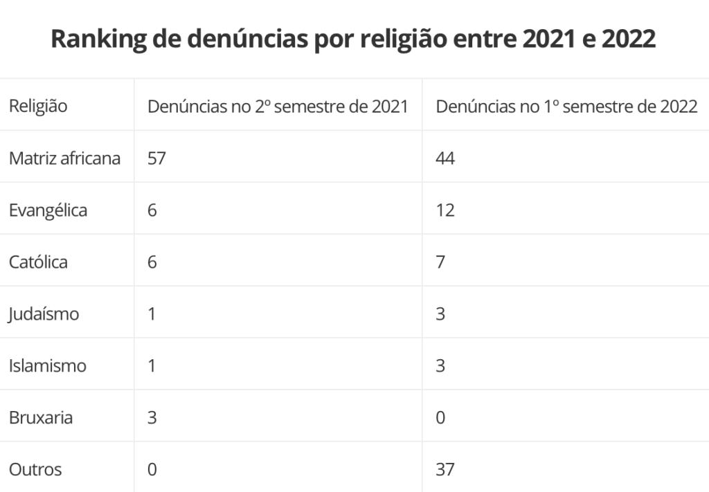 Desde o segundo semestre de 2021, a Secretaria da Justiça começou a classificar as denúncias feitas por sujeitos que sofriam com o preconceito e atentados religiosos por religião. Durante um ano, em média, as crenças de matriz africanas lideraram a lista de acusações, tendo 57 registros no 2º semestre de 2021 e 44 no 1º semestre de 2022.